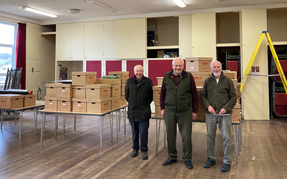 Most of the material had been catalogued and stored prior to the Covid lockdown in 2020. Here are two photographs, one of which includes John, Nick and Tony, three of the committee members who completed this work. All those who took part in this huge task deserve the greatest praise for their hard work.